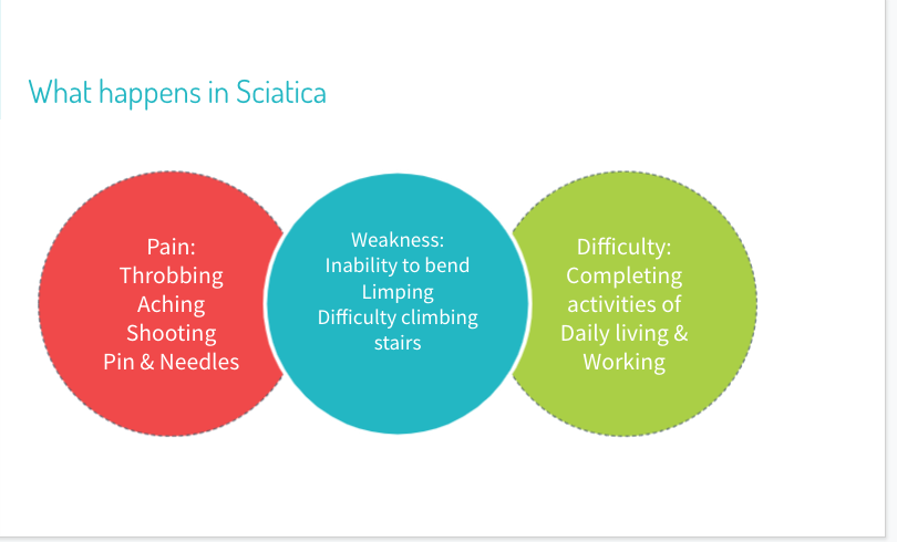 Sciatica is a condition that occurs when a nerve in your lower back is injured, pinched, or compressed, causing pain or other symptoms that can extend from the lower back to hip, leg and foot.